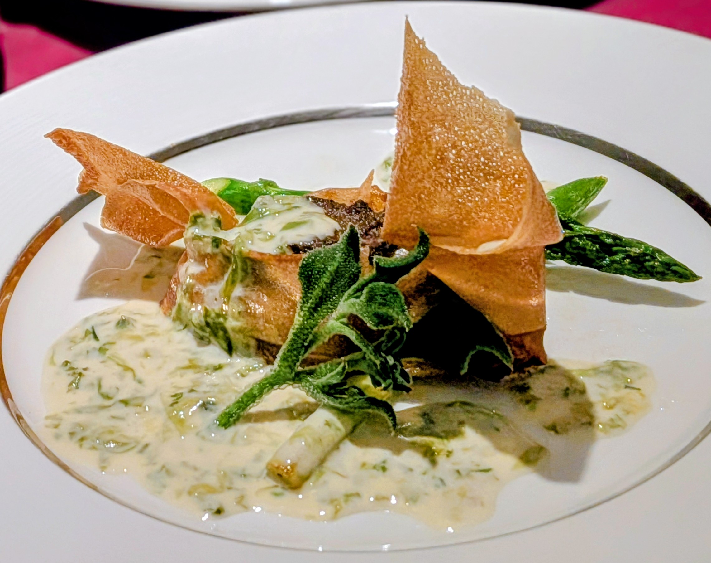 待ちに待った満開の桜 本日はあいにくの激しい雨、 ですが、足元を見れば桜の花びらの絨毯 空を見上げれば、雨粒にきらめく桜がとても素敵です^o^ 雨桜としっとりと落ち着いた空気の中で、 温かいお料理はいかがでしょうか? ~鮮魚のパートブリック包み 青海苔のクリームソース~ パリパリの薄皮に包まれた白身魚、青海苔と濃厚なクリームソースがたまりません`(*>﹏<*)′ シェフこだわりのソース、 余ったソースはパンと一緒に 最後の一滴まで楽しんでいただけたら感激です。 皆様のご予約スタッフ一同お待ちしております╰(*°▽°*)╯